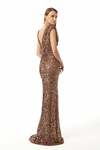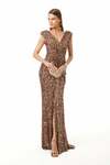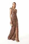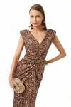 Büzgülü Önden Yırtmaçlı V Yaka Bakır Maxi Payet Elbise