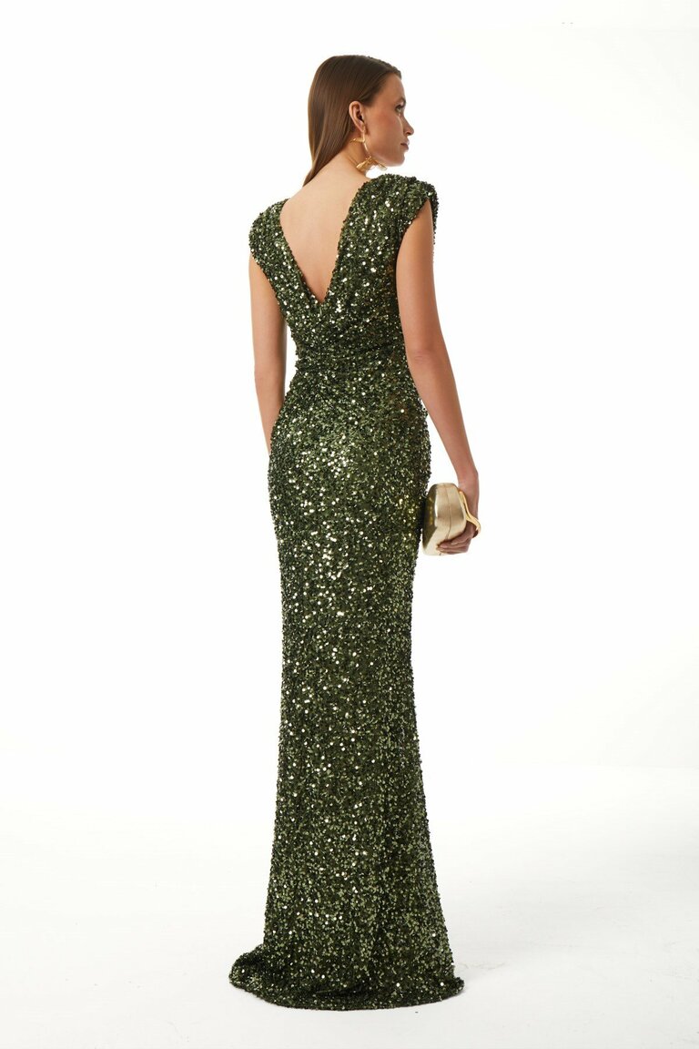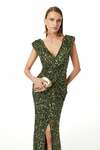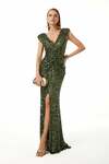 Önden Yırtmaçlı-Arkadan Gizli Fermuarlı-V Yaka-Kuyruklu-Büzgü Detaylı Elbise.