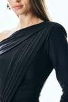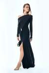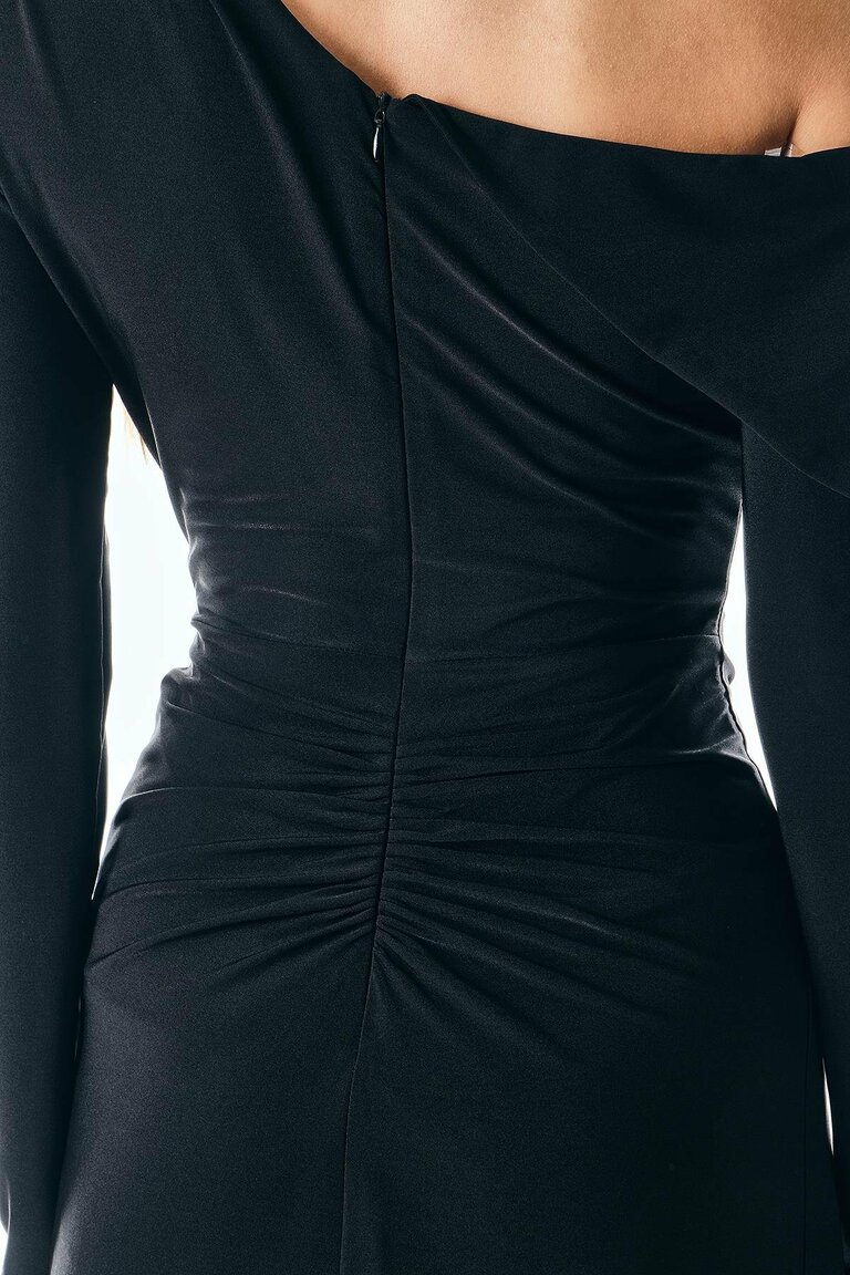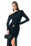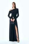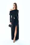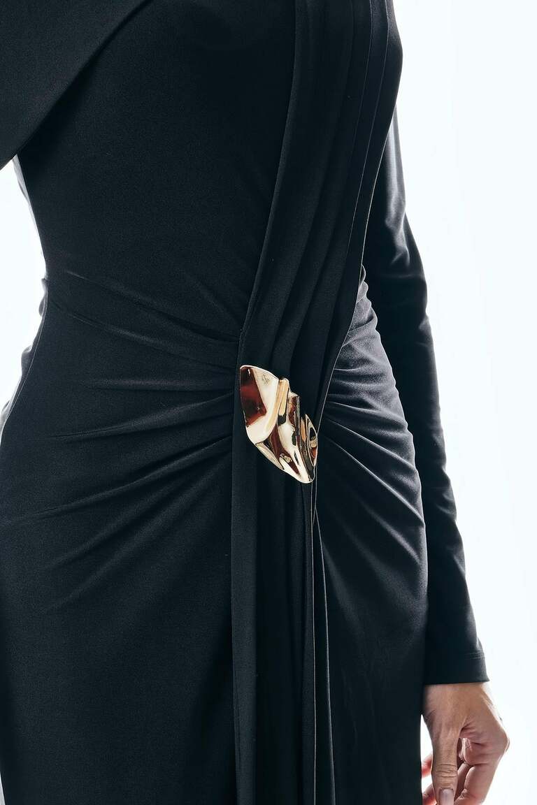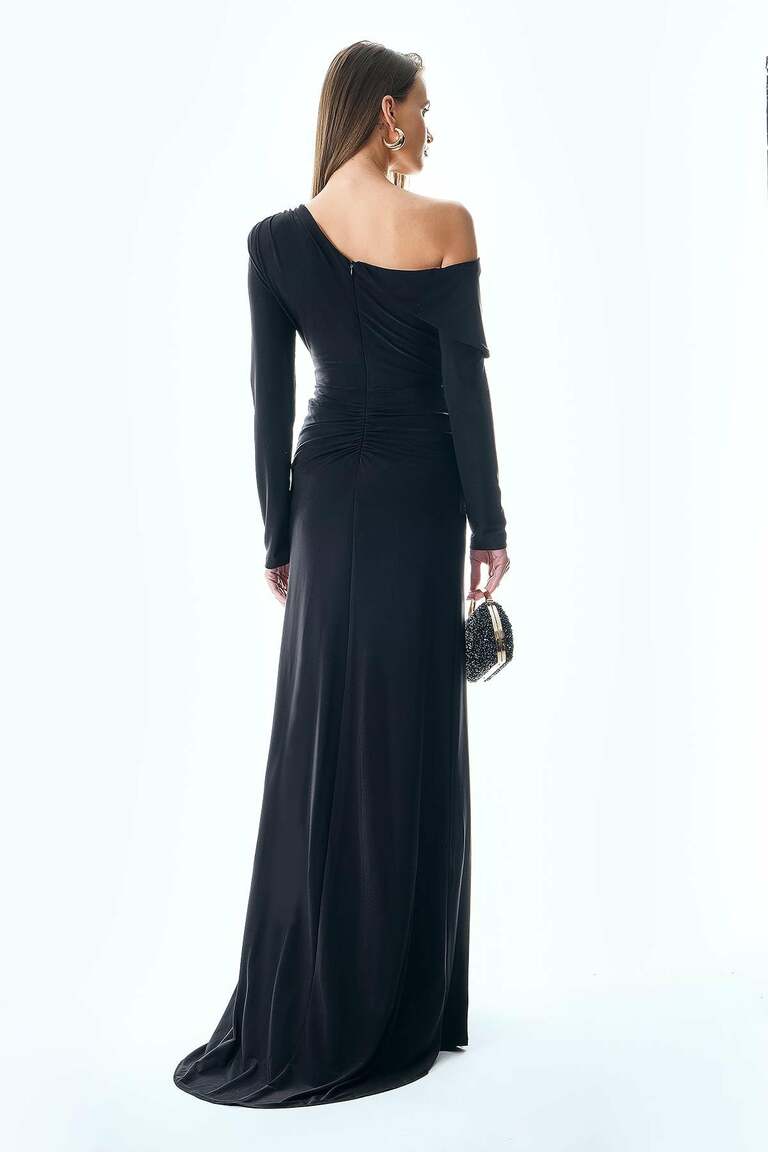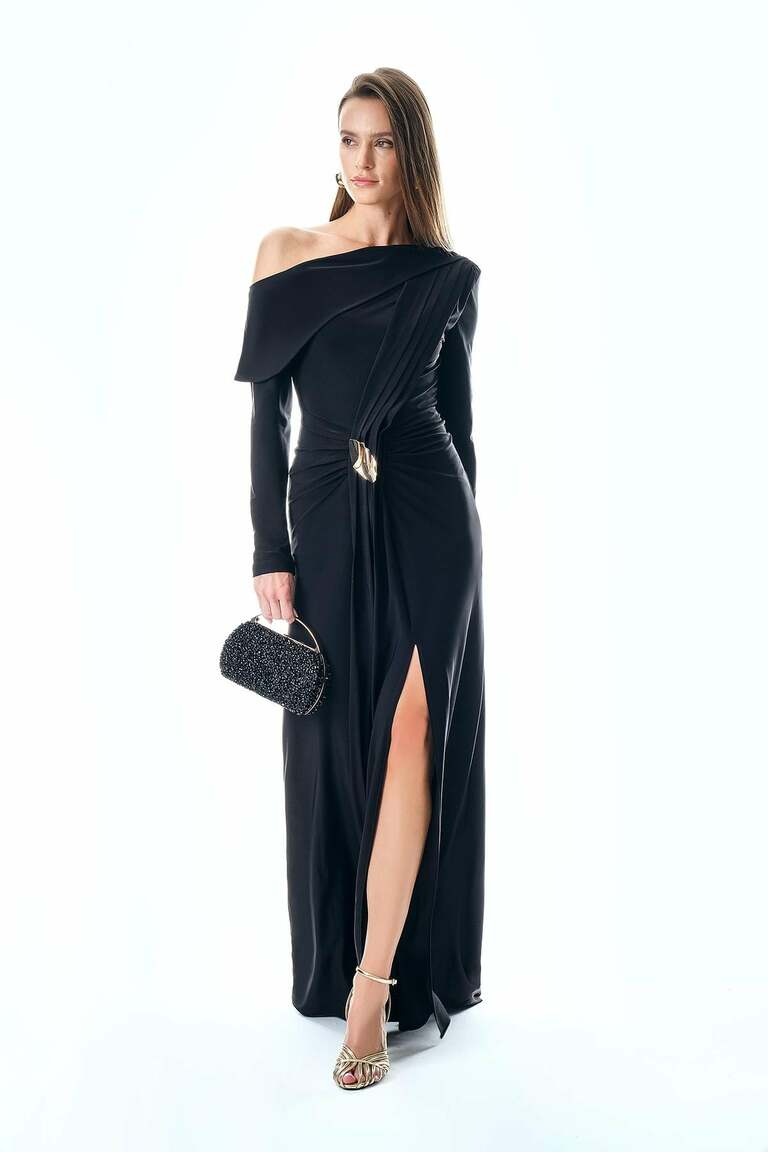 Uzun Kollu-Astarlı-Gold Aksesuarlı-Önü Drape Detaylı-Yırtmaçlı -Gizli Fermuarlı-Esnek Yumuşak Dokulu