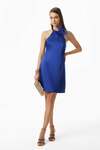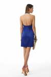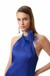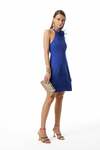 Çiçek Broş Aksesuarlı-Arka Ortada Gizli Fermuarlı-Arka Yaka Birit Düğmeli-Astarlı-Mini Boy Koyu Saks Mavisi Elbise
