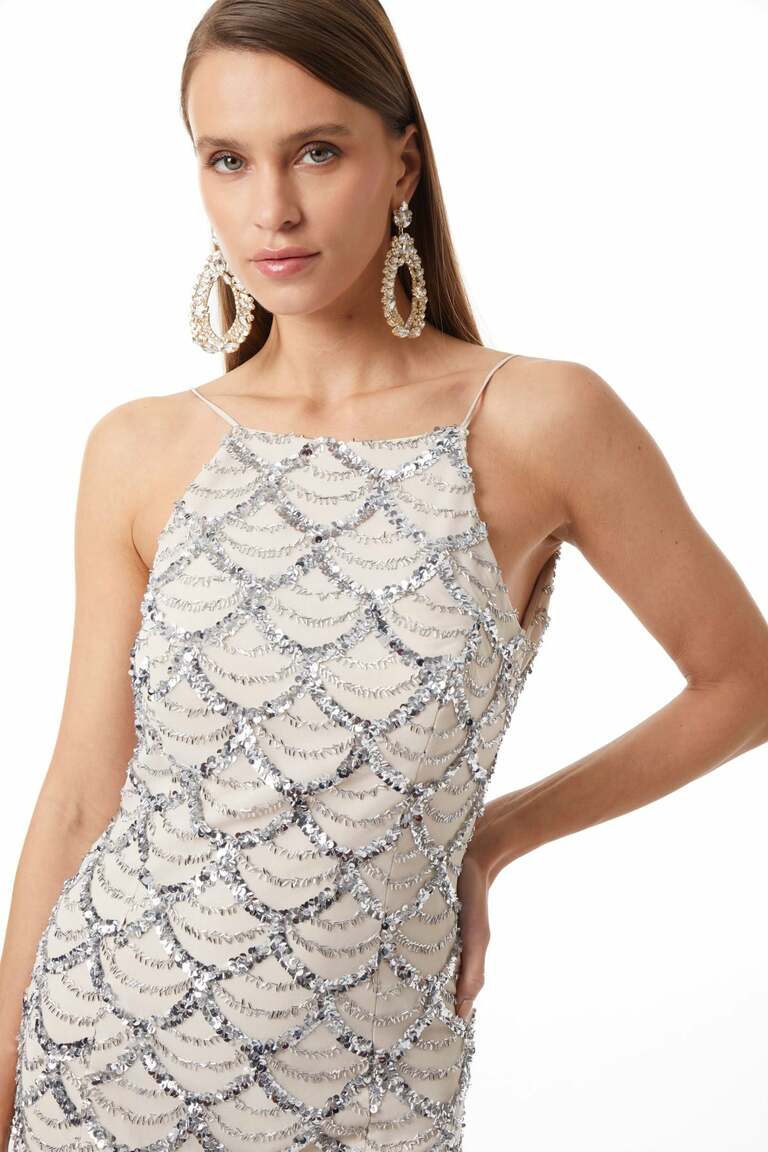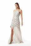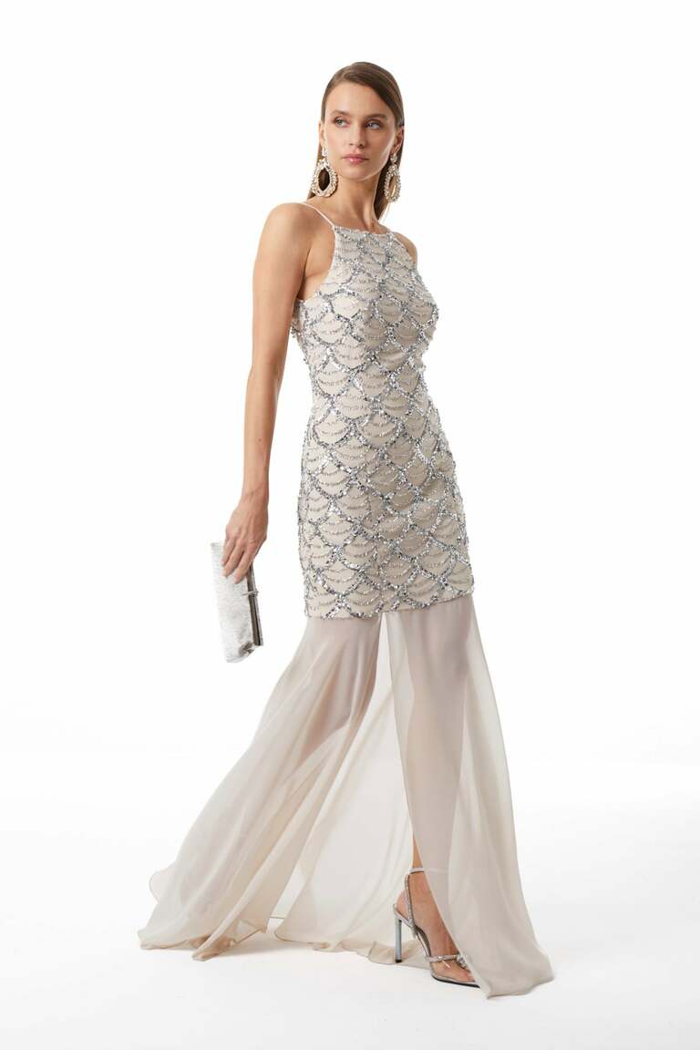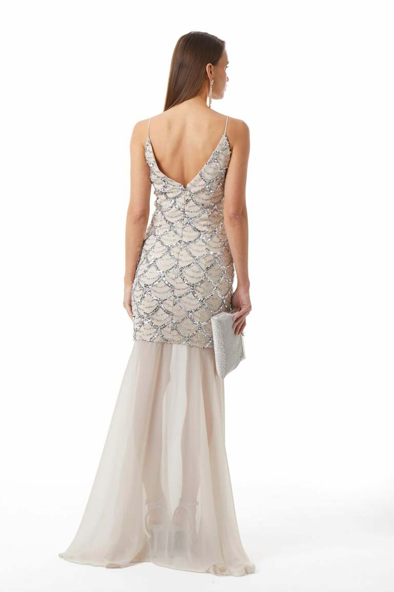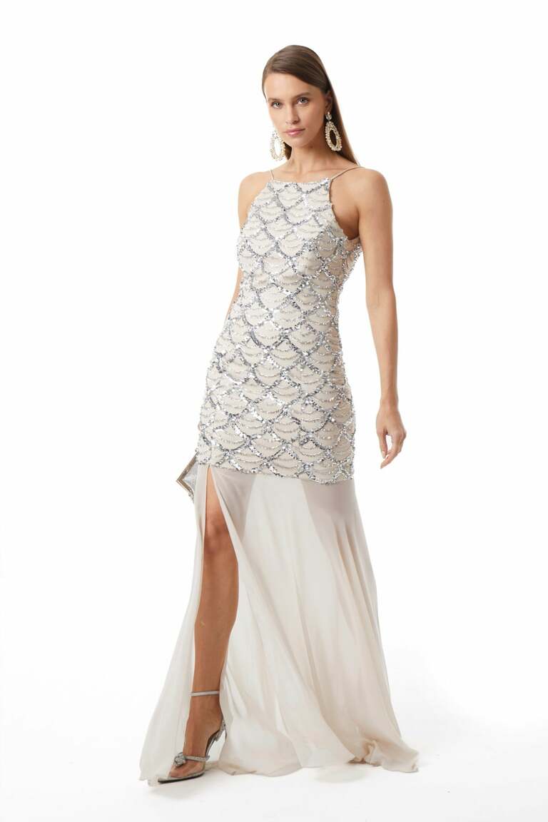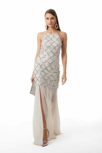 İnce Askılı-Gizli Fermuarlı-Önden Yırtmaçlı-Maxi Boy Elbise.