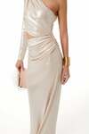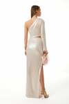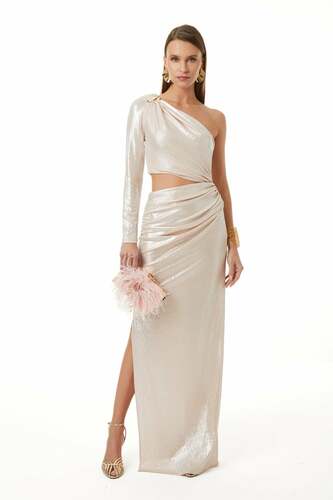 Gold Metal Aksesuarlı-Tek Omuz-Uzun Kollu-Yandan Gizli Fermuarlı-Astarlı Maksi Boy Elbise.